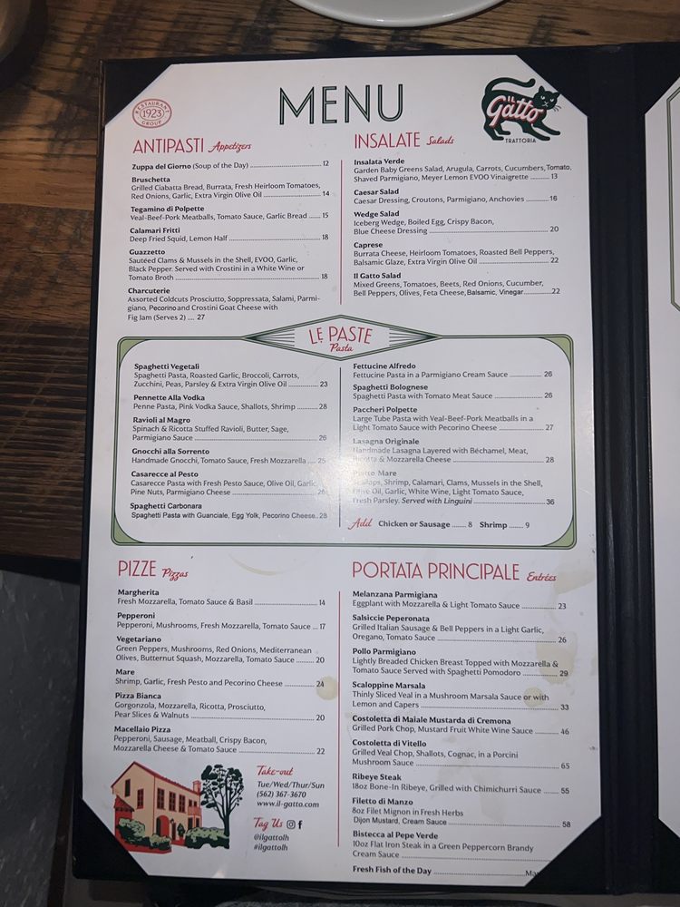Located in La Habra, CA, Il Gatto is a cozy Italian restaurant offering a range of amenities such as reservations, delivery, outdoor seating, and a full bar. Customers praise the homemade pasta, with Tiffany H. noting the freshness and tenderness in dishes like spaghetti Bolognese. The attentive service and live piano music on Sundays add to the overall dining experience. Elle C. emphasizes the homestyle Italian dishes reminiscent of a mother's cooking, while Mariah M. appreciates the hot and delicious food served in the pleasant outdoor seating area. The menu, though brief, offers a great selection of food and drinks, as confirmed by Matt H.'s positive experience. Susan M. echoes the excitement of finally trying Il Gatto, with a mention of the lasagna and champagne as standout items. For a taste of comforting Italian fare in a welcoming atmosphere, Il Gatto comes highly recommended.